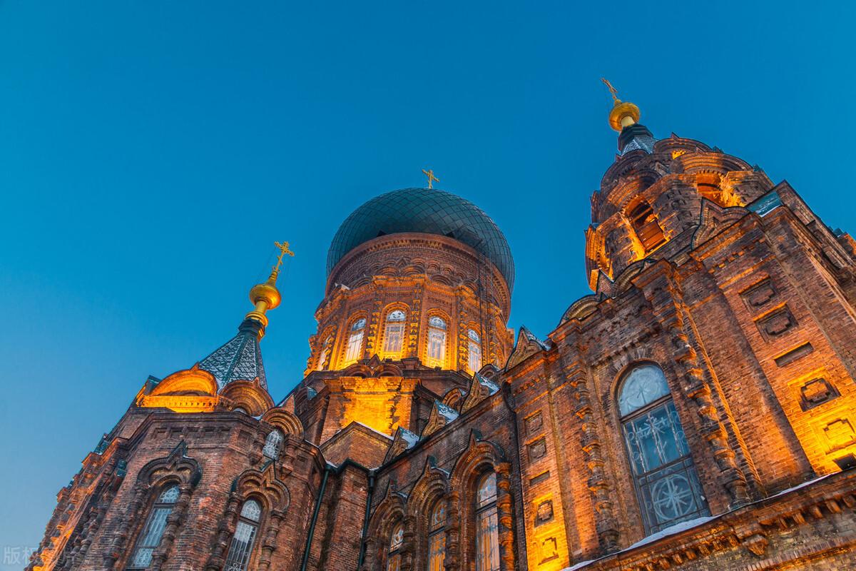 圣索菲亚大教堂是哈尔滨的著名地标,也是中国目前保存最完整的拜占庭式建筑。可以在外面拍照打卡,也可以进入内部参观(需要购买门票),绿色的洋葱头式大穹顶十分醒目,满满的异域风情。