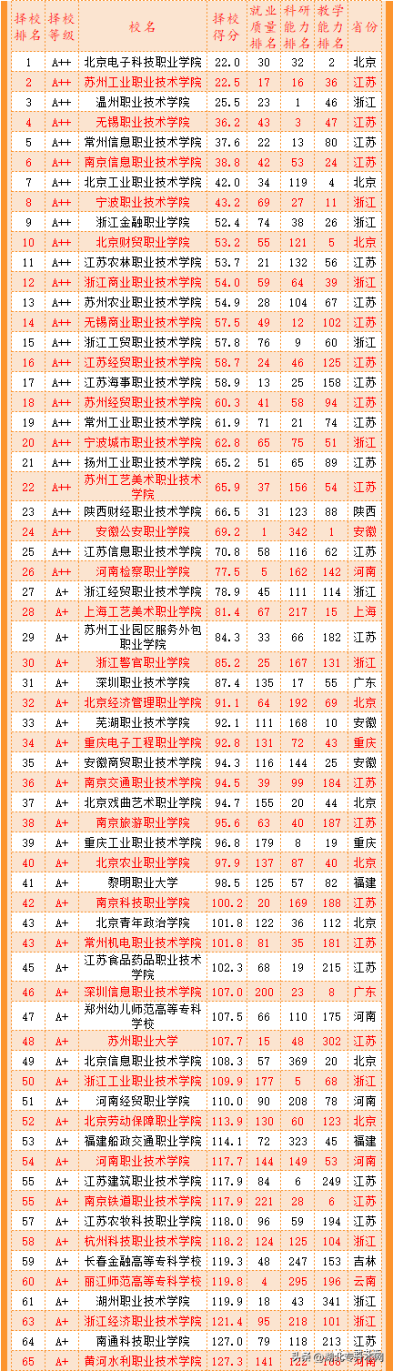 三、65所中国一流高职高专名单